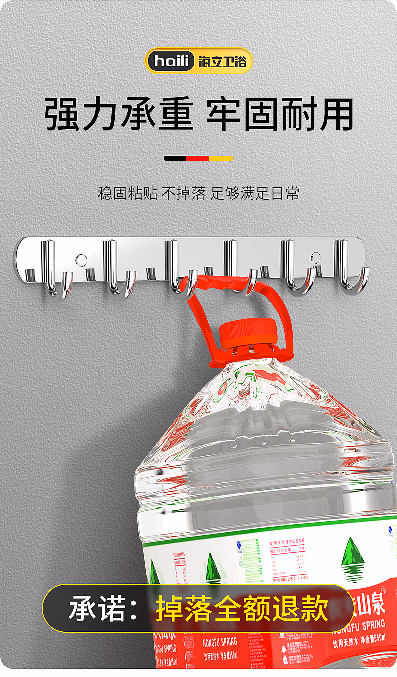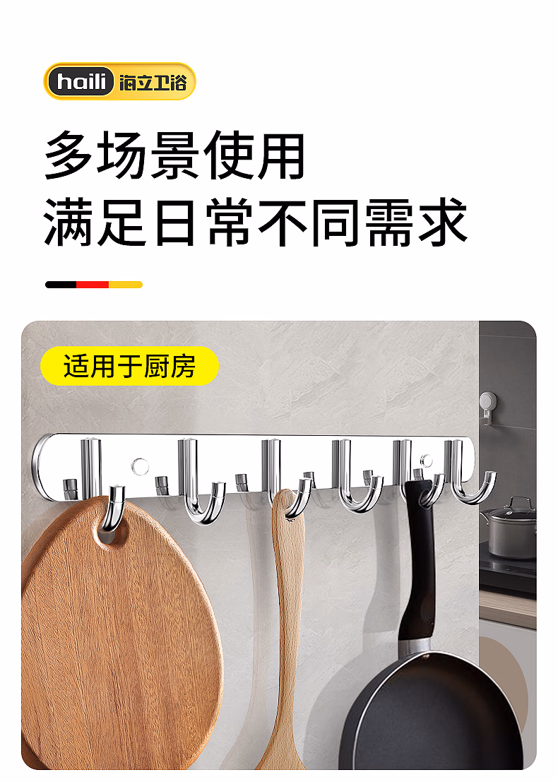 > 海立304不锈钢免打孔厨房墙壁挂钩连排粘钩浴室卫生间衣服帽钩30601-6