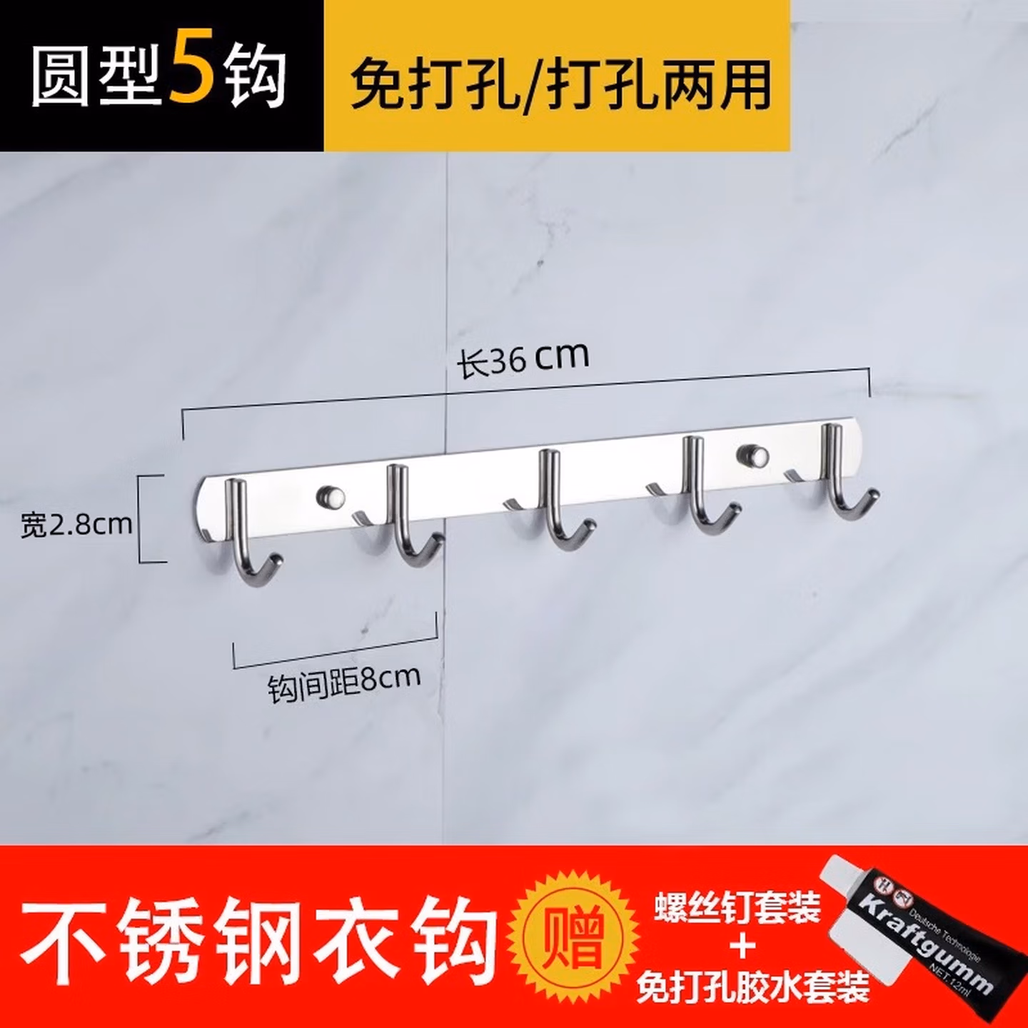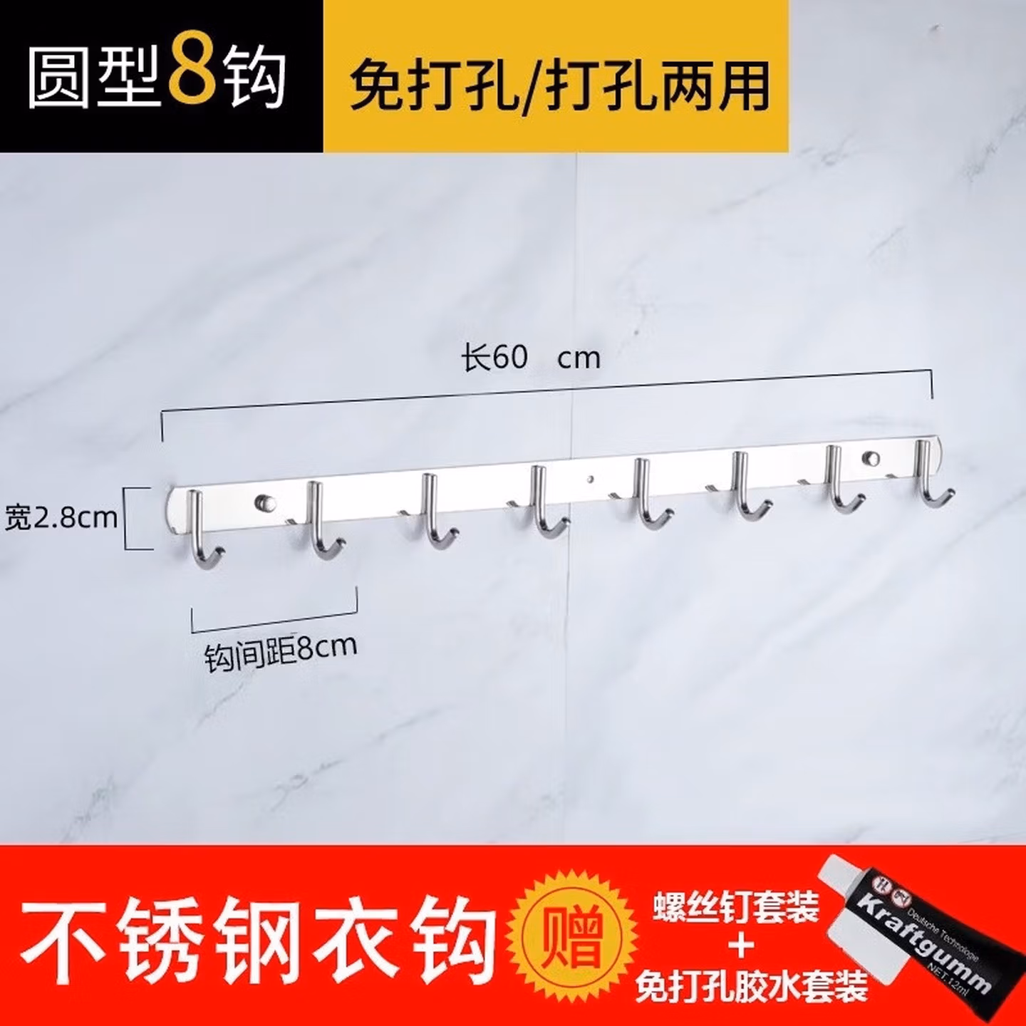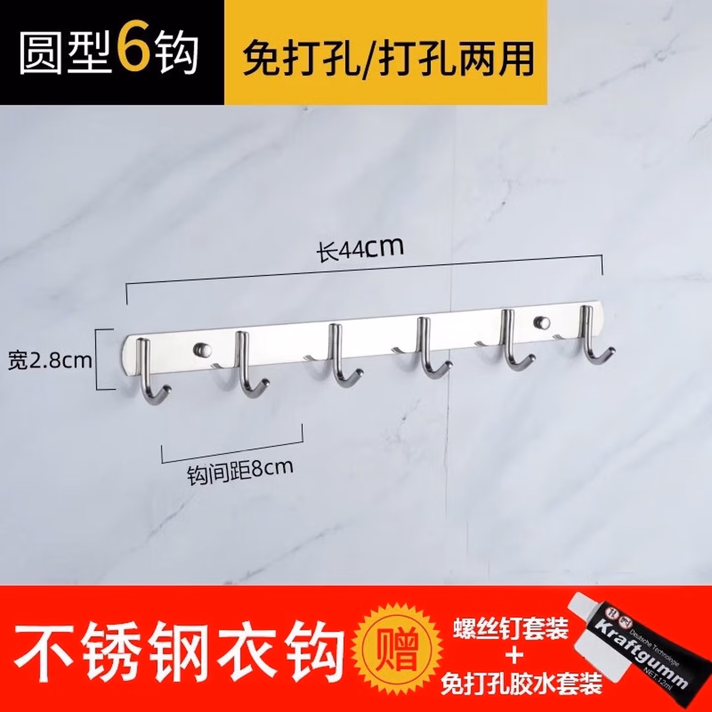 304不锈钢免打孔/打孔厨房挂钩置物架排钩 [304加厚]6钩