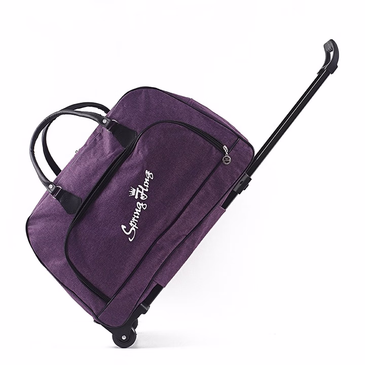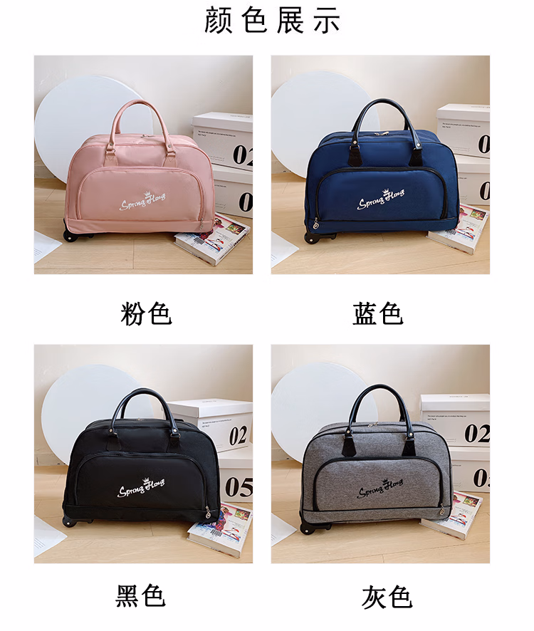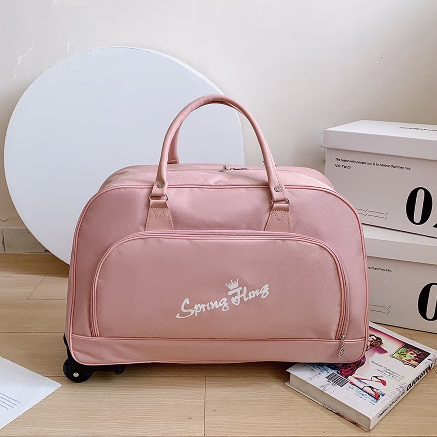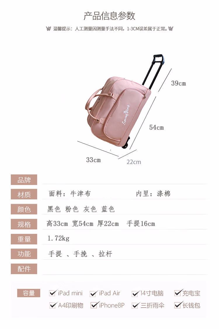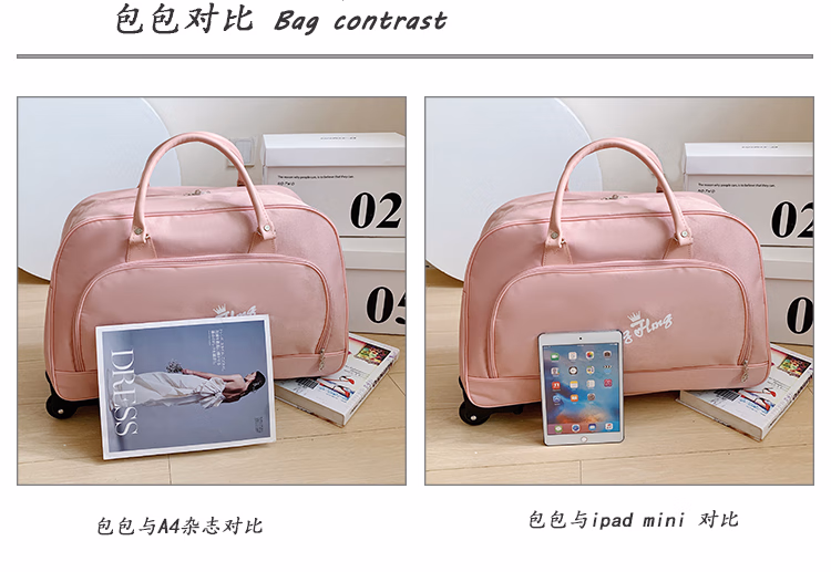 大容量旅行包女出差手提行李袋拉杆包可折叠带滑轮拖拉包男登机包 粉色英文 大号