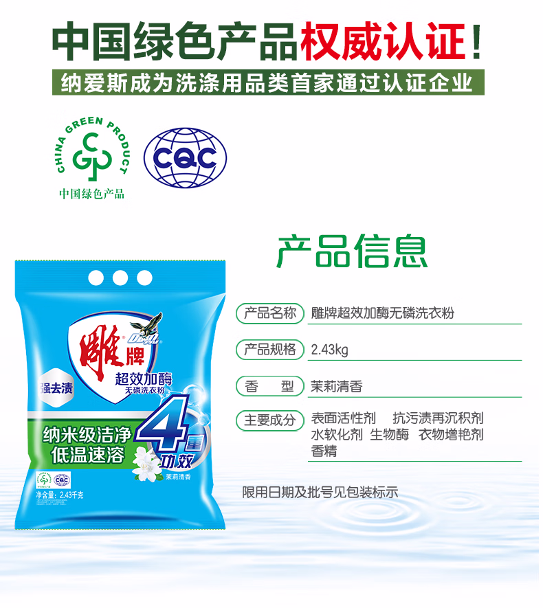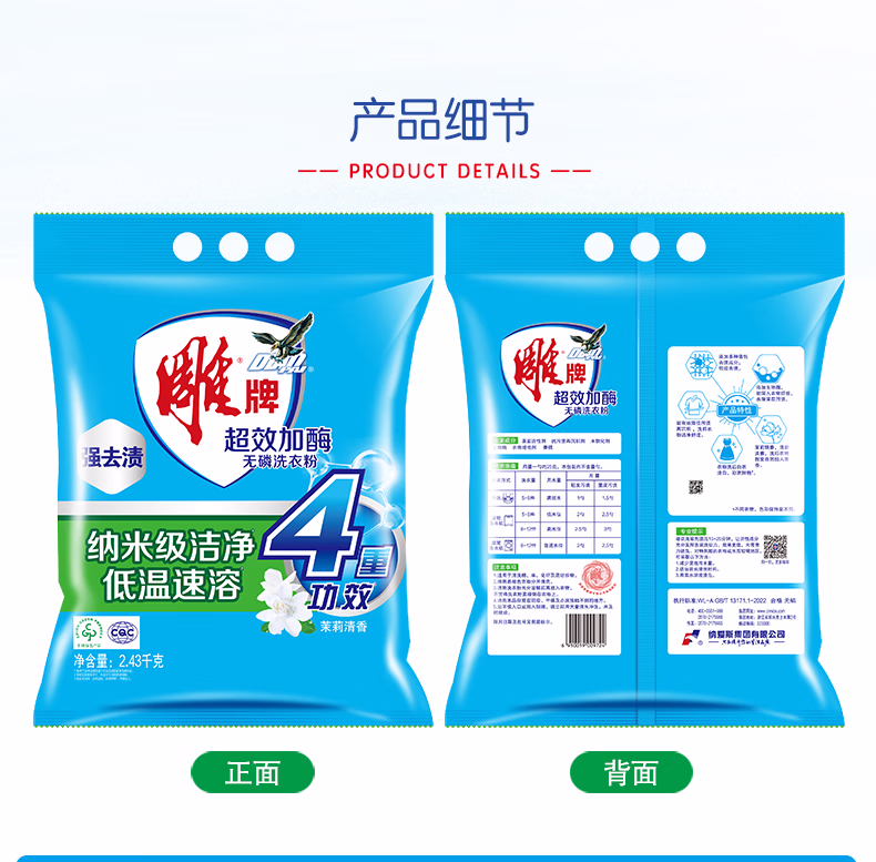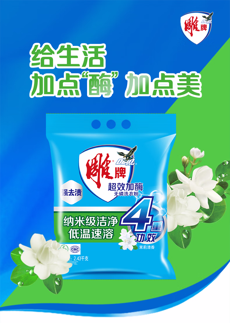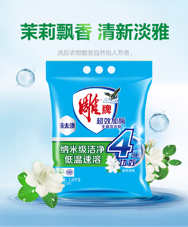 > 雕牌 超效加酶洗衣粉 茉莉清香 2.56斤 无磷 低温速溶 强效去渍