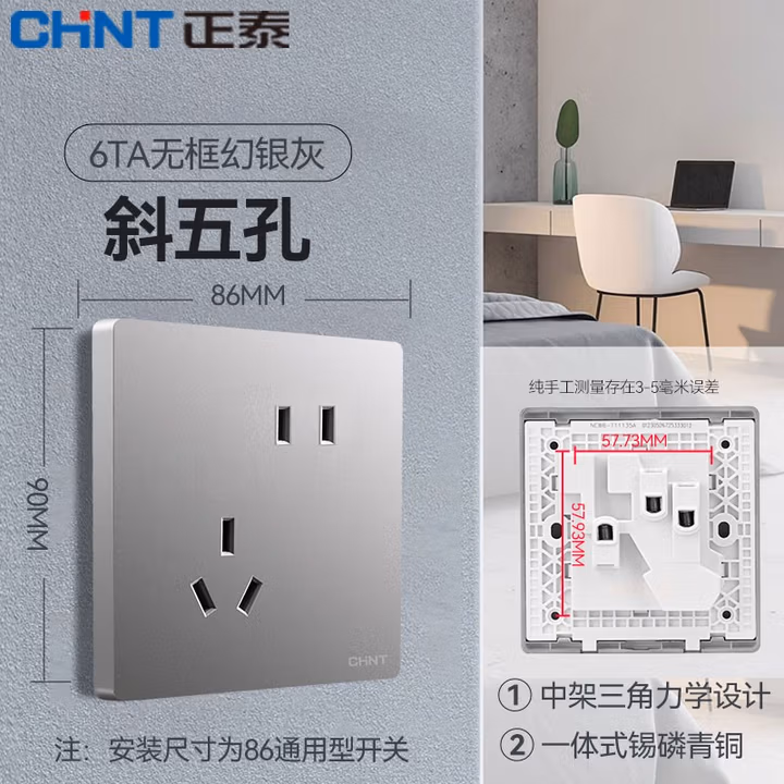 > 正泰开关插座面板 黑灰色开关插座 二三插五孔5孔插座面板16a插座开关 联体插座 NEW6T灰色 五孔插座